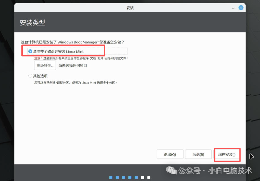 选择【清除整个磁盘并安装Linux Mint】