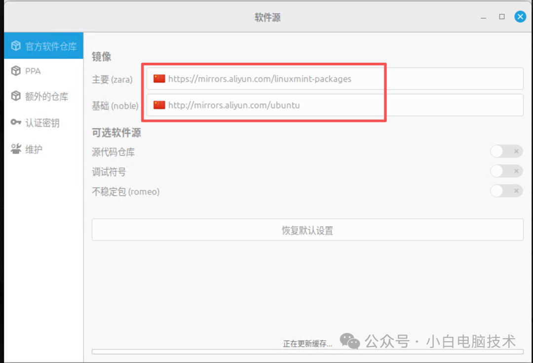 如果【软件管理器】更新很慢,建议打开【软件源】,更改这两个为aliyun服务器或其他服务器。(不一定要用小白图里的这两个链接)