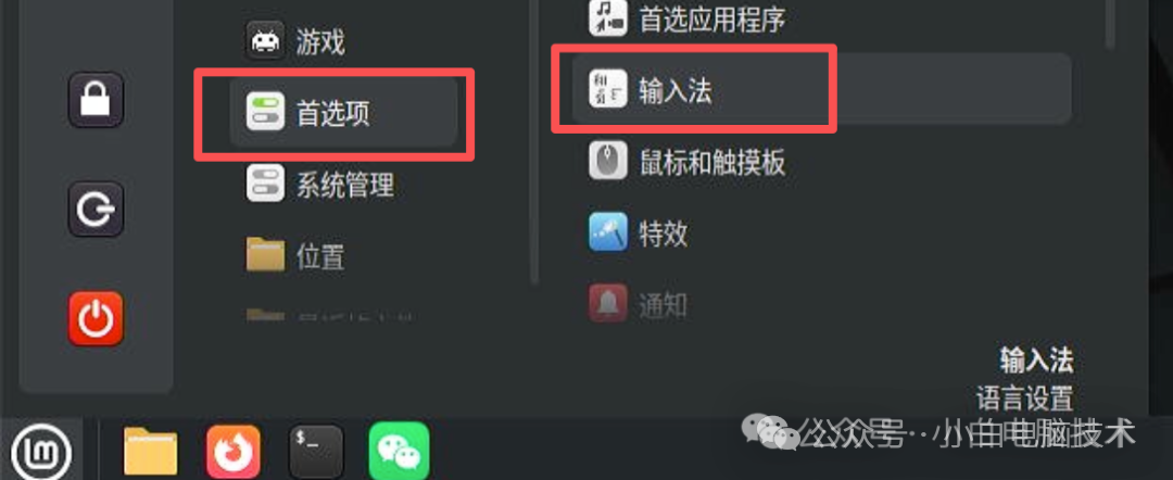 第一次进入需要调出中文输入法,点击开始菜单,找到【首选项】-【输入法】