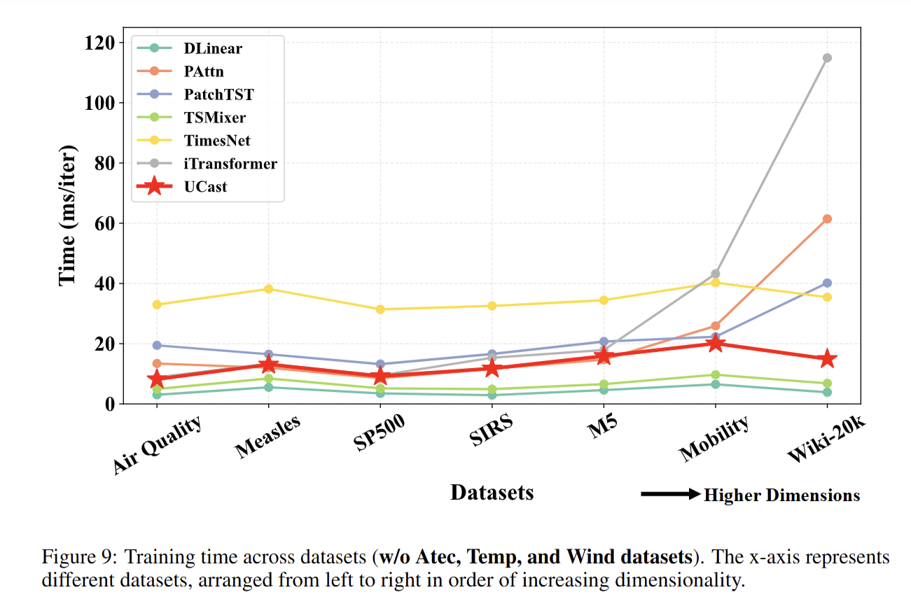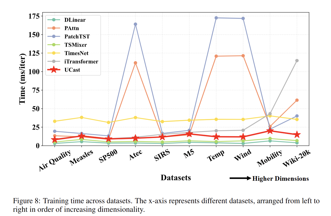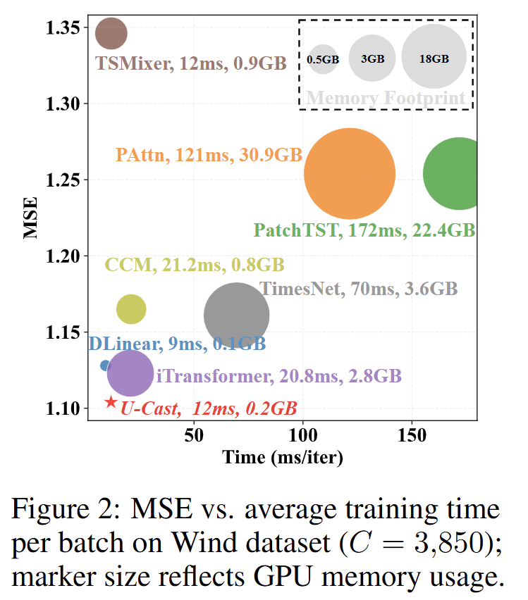 实测验证(A100 显卡,850 通道数据):U-CAST 每步训练仅需 12 毫秒、0.2GB 显存,而 iTransformer 需 20.8 毫秒、2.8GB 显存;通道数越多(如 2 万通道),U-CAST 的速度和显存优势越明显,不会出现传统模型 "通道爆炸" 导致的训练卡死问题。