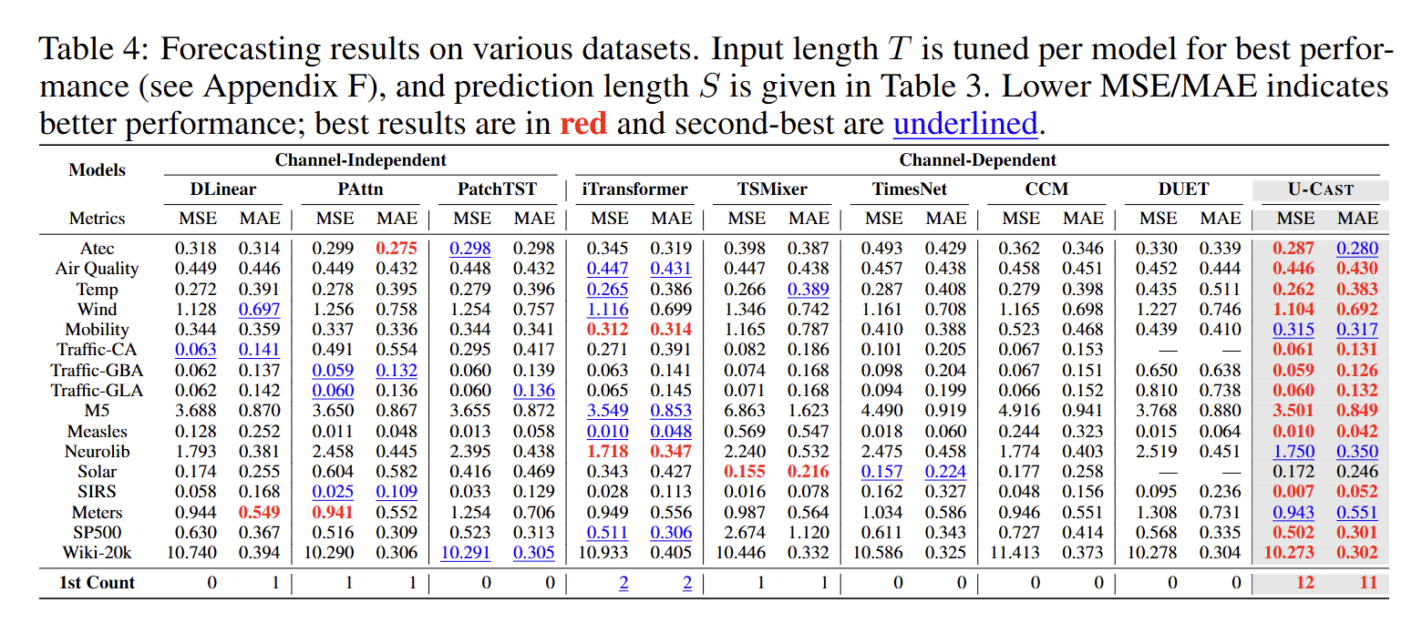 综上,论文首次系统论证了"高维+通道依赖"带来的理论增益,提供了可复现的大规模评测环境,并给出兼顾精度与效率的 U-CAST 解决方案,为后续 HDTSF 研究奠定模型与数据基础。