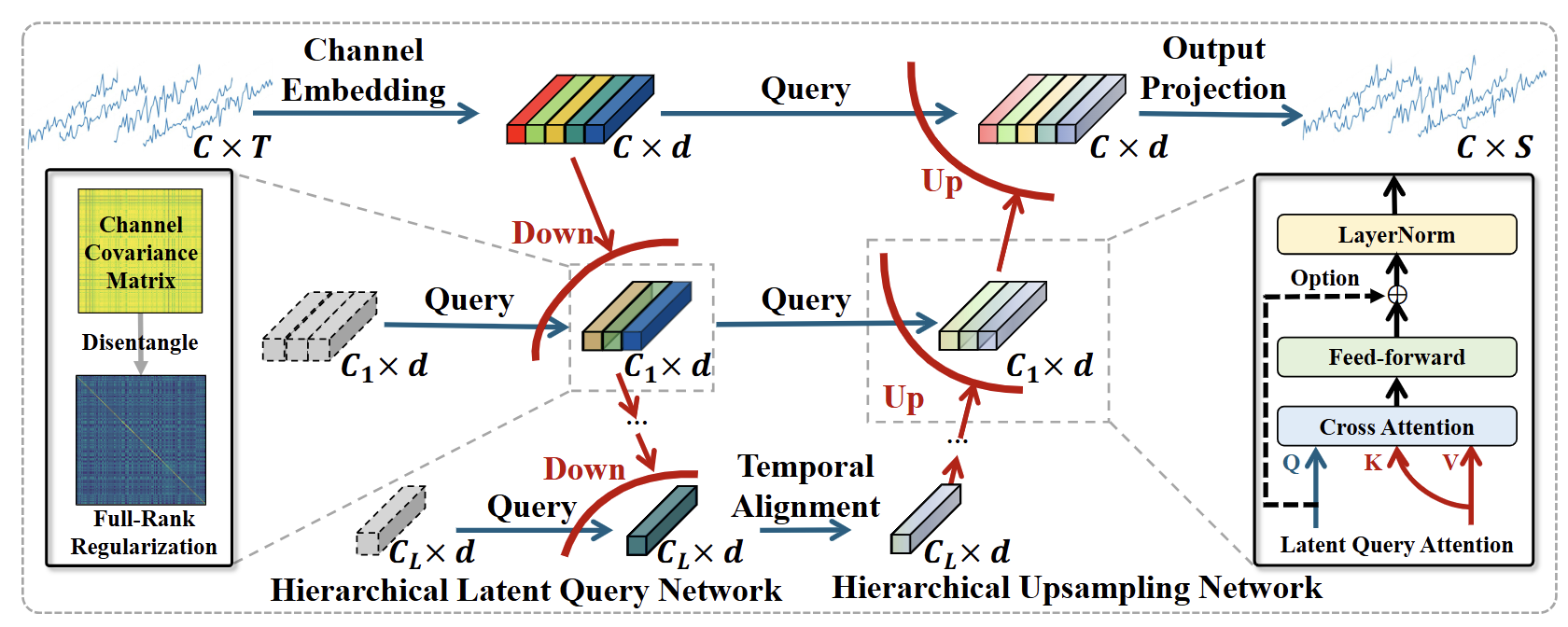 - Hierarchical Upsampling Network:反向重采样,通过跨层 skip-connection 恢复原始通道维度,实现端到端预测。