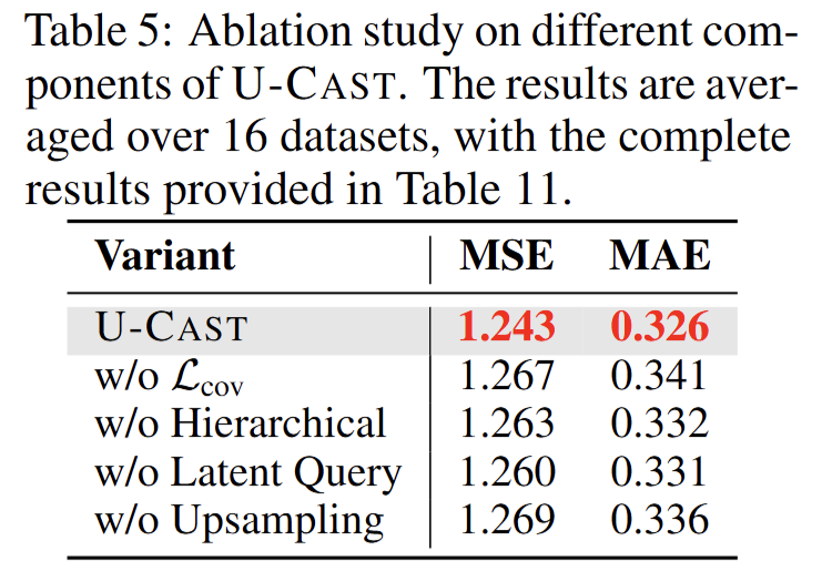 组件消融:逐一移除 U-CAST 的关键模块(满秩正则、层级结构、潜在查询、上采样),对比模型性能变化;
