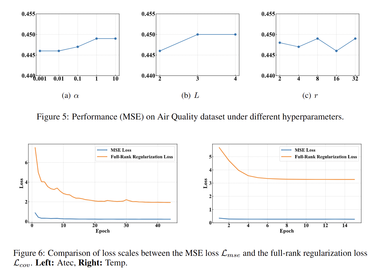 总体损失:结合 "预测误差损失(MSE,衡量预测值与真实值的差距)" 和 "满秩正则化损失",通过自适应权重 α(0.001~10 之间自动调整)平衡 "预测精度" 和 "变量解耦效果",避免过度压缩导致信息丢失。