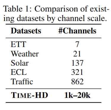 | TIME-HD(本文) | √(16 个数据集) | √ | 1k--20k | 首个专为 HDTSF 设计的综合基准 |