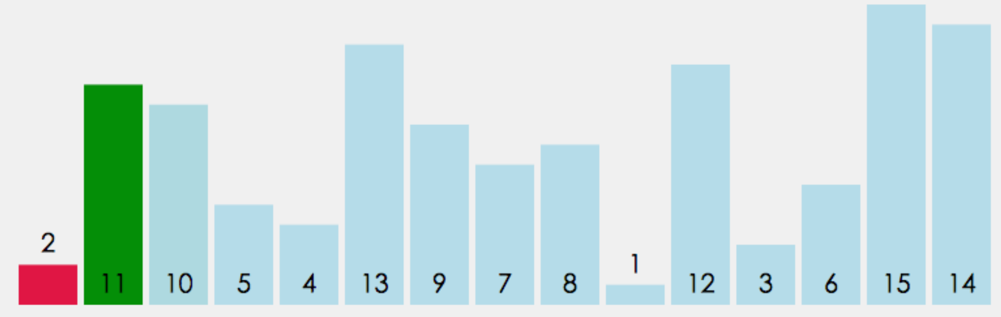 - 持续每次对越来越少的元素重复上面的步骤,直到没有任何一对数字需要比较