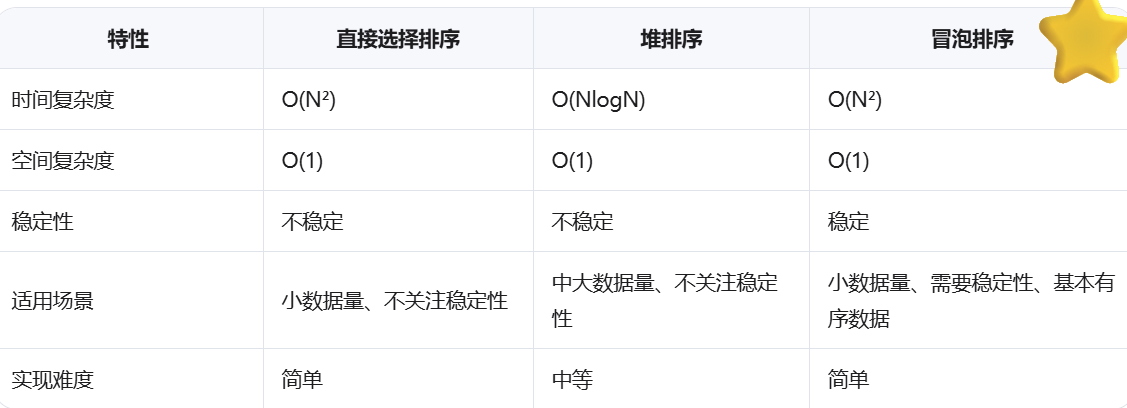 - 数据量 < 100 且需要稳定排序:选择冒泡排序(或插入排序)