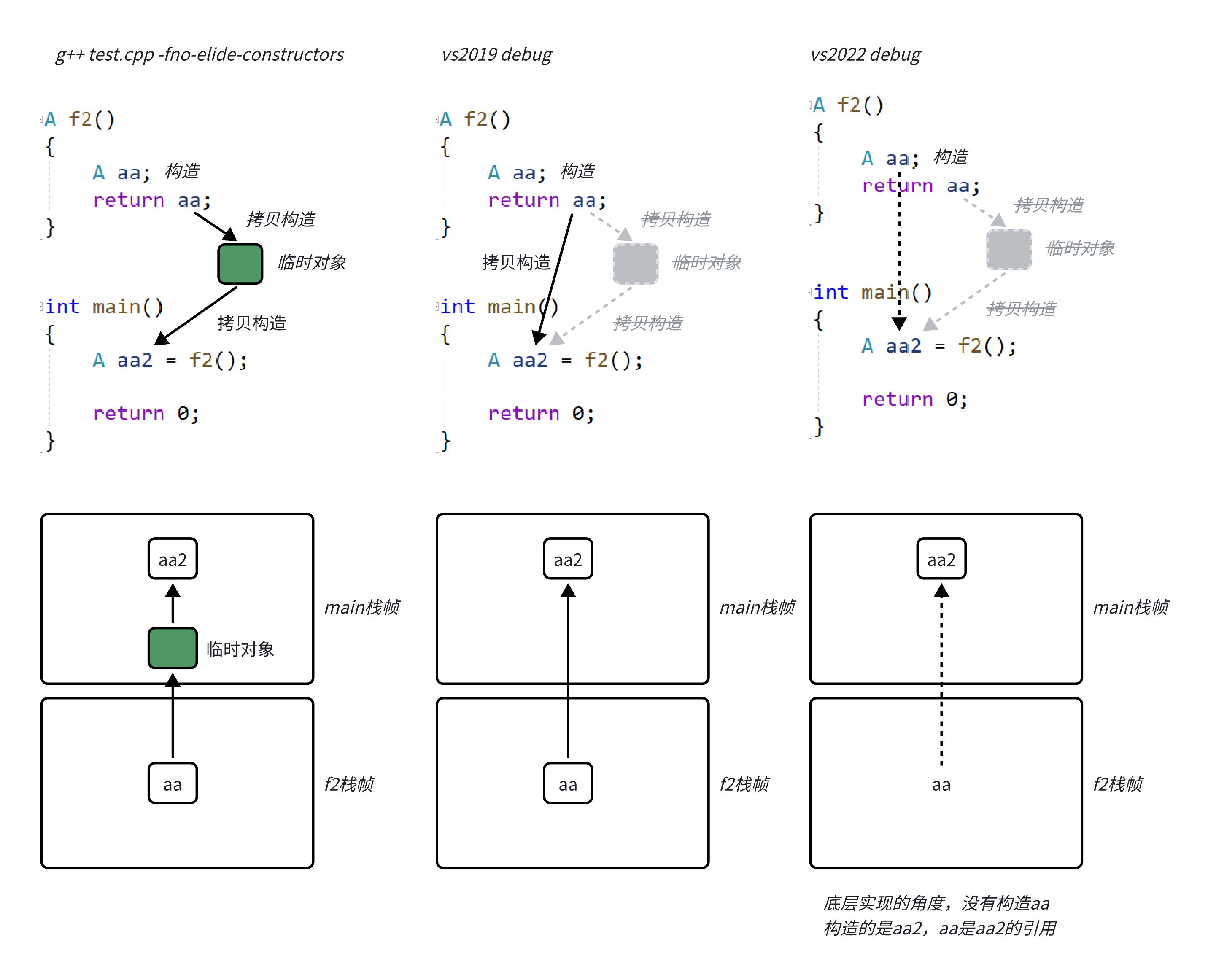 A aa2 = f2(); // 理论上:f2内构造 + 拷贝返回 + 拷贝构造aa2