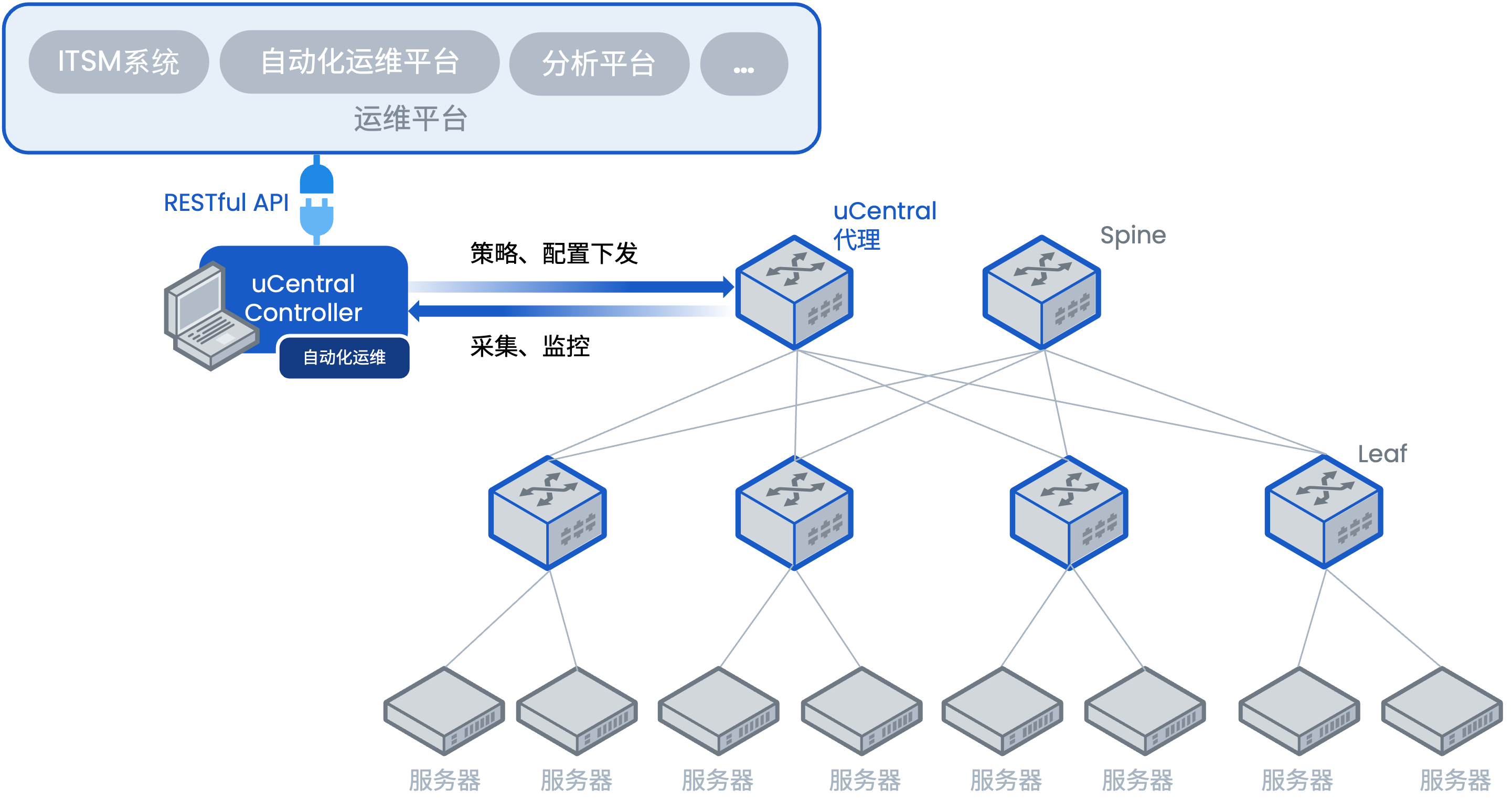 uCentral Controller不仅管理网络,还通过北向接口(通常是RESTful API)将网络能力和数据开放给更上层的运维系统(如ITSM系统、自动化运维平台、大数据分析平台等),从而实现IT系统的端到端联动和自动化