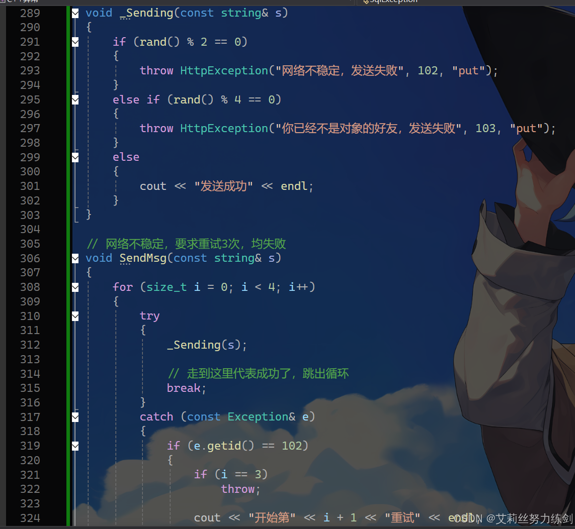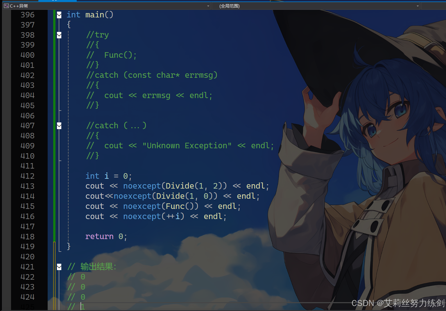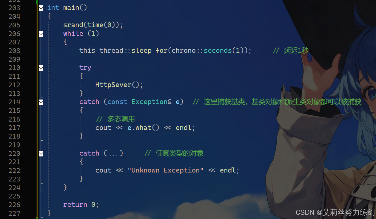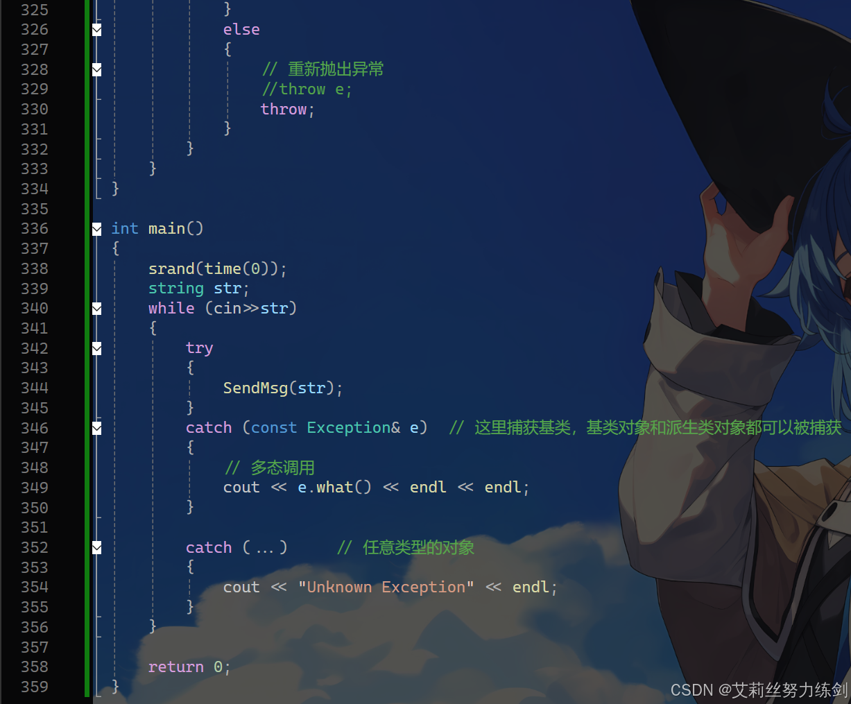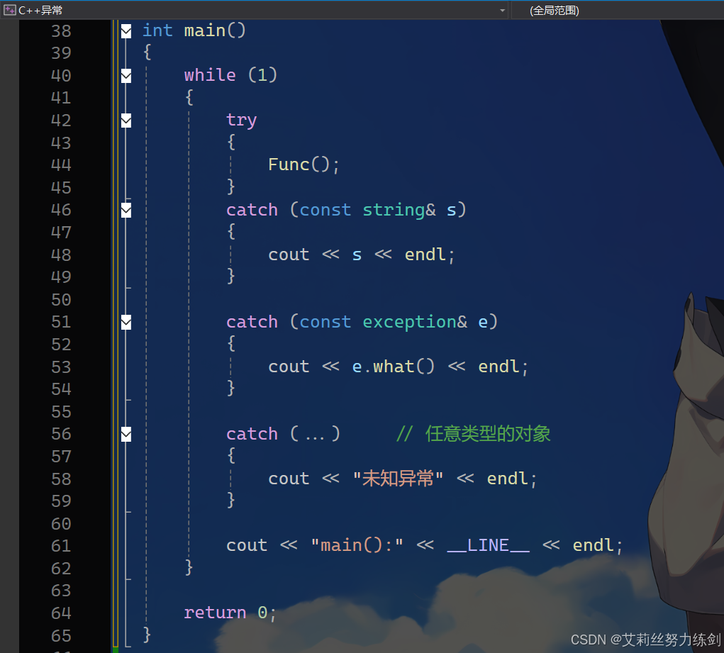 如果到main函数,异常仍旧没有被匹配就会终止程序,不是发生严重错误的情况下,我们是不期望程序终止的,所以一般main函数中最后都会使用catch(...),它可以捕获任意类型的异常,但是我们不知道异常错误是什么。