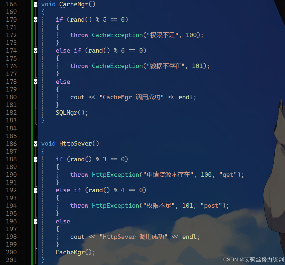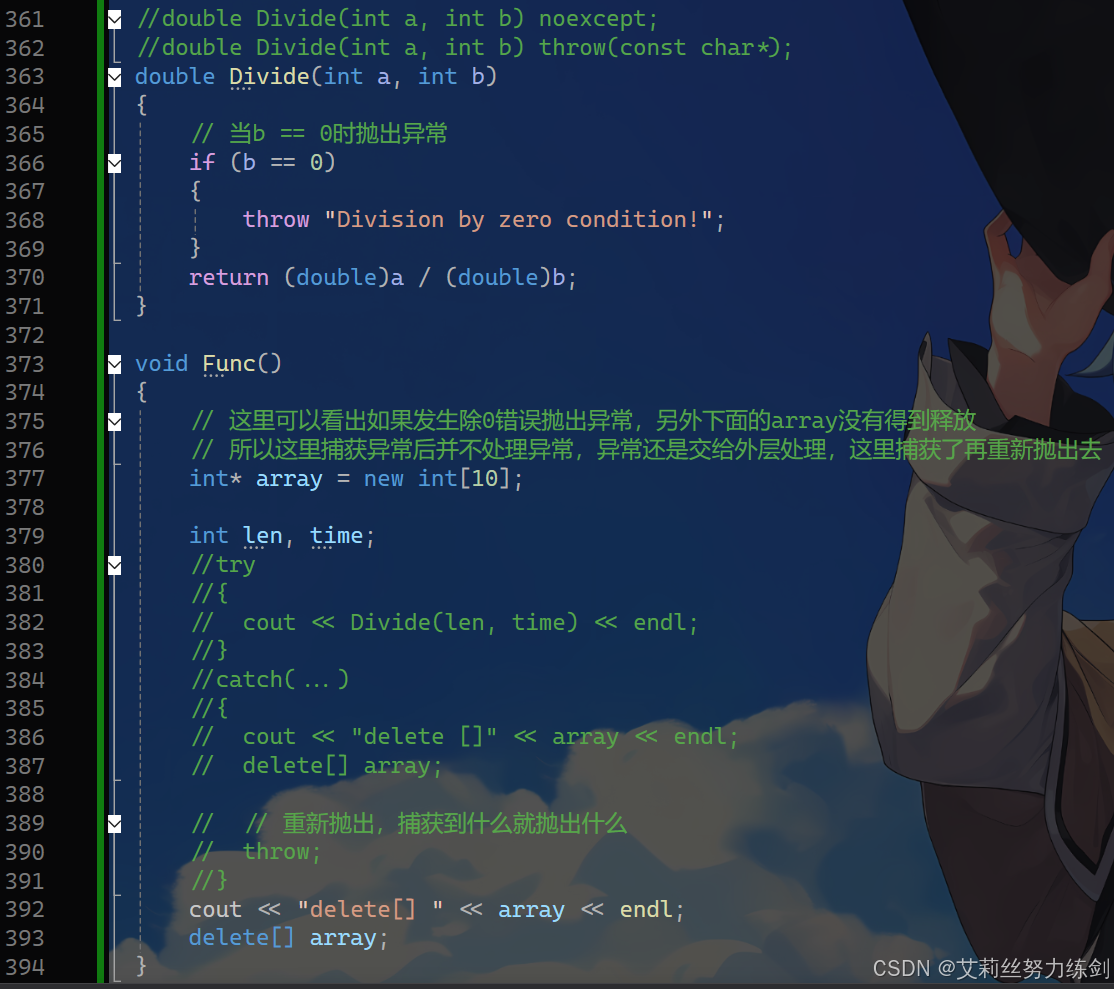 1、异常抛出后,后面的代码就不再执行,前面申请了资源(内存、锁等),后面进行释放,但是中间可能会抛异常就会导致资源没有释放,这里由于异常就引发了资源泄漏,产生安全性的问题。中间我们需要捕获异常,释放资源后面再重新抛出,当然后面智能指针章节讲的RAII方式解决这种问题是更好的。