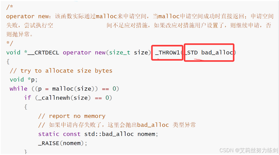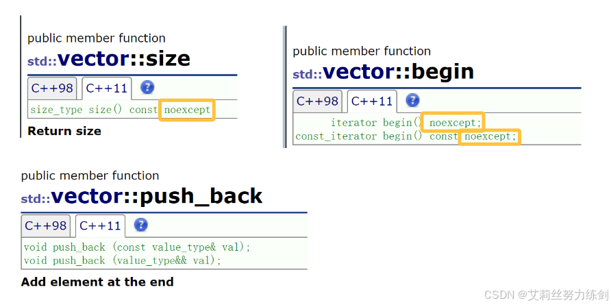 C++98的方式这种方式过于复杂,实践中并不好用,C++11中进行了简化,函数参数列表后面加noexcept表示不会抛出异常,啥都不加表示可能会抛出异常。