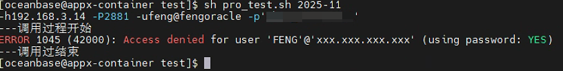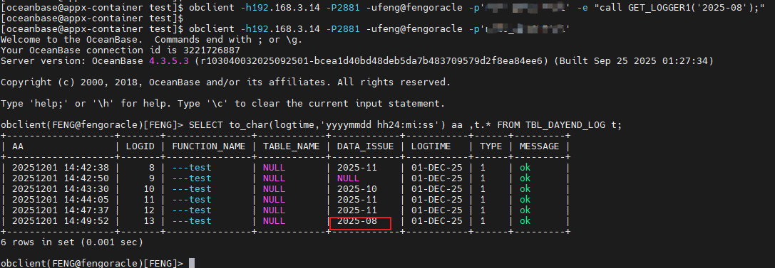 obclient -h192.168.3.14 -P2881 -ufeng@fengoracle -p'xxx' -e "call GET_LOGGER1('2025-08');"