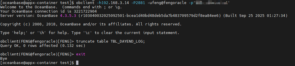 obclient -h192.168.3.14 -P2881 -ufeng@fengoracle -p'xxx1'