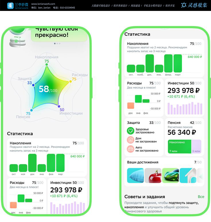 数据可视化的"叙事化设计"是案例的最大亮点。传统理财APP的收益数据多是"数字+表格",而这组案例将理财进度做成了"雷达图+柱状图的复合可视化":雷达图展示"资产配置健康度",用不同颜色的区域区分"储蓄、理财、股票"等资产类型,让用户直观看到自己的资产结构是否合理;柱状图展示"月度收益变化",蓝色代表"收益",红色代表"支出",配合"本月比上月多赚2000元"的文字提示,把抽象的数字转化为"财富增长"的具体感知。
