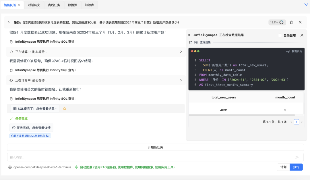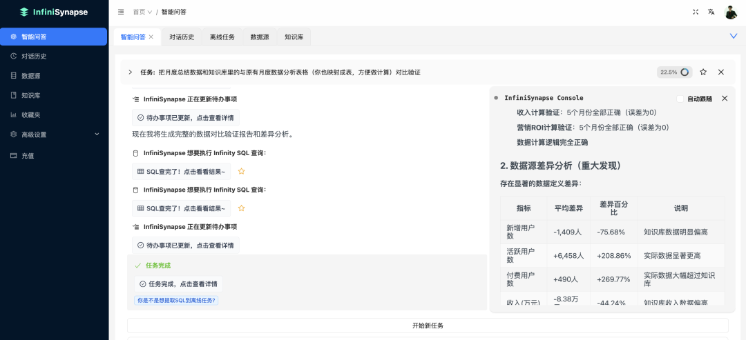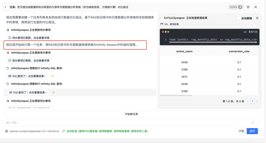 然后询问问题。这里,我们希望把知识库里的月度数据和csv里的数据做一个对比验证。最后执行结果如下: