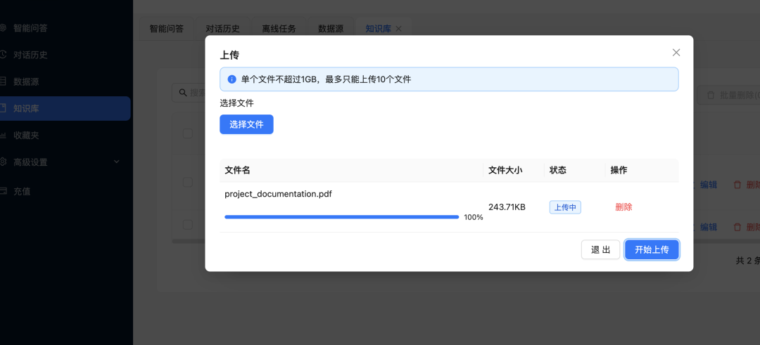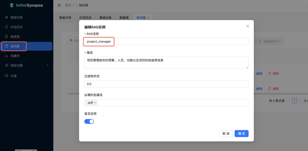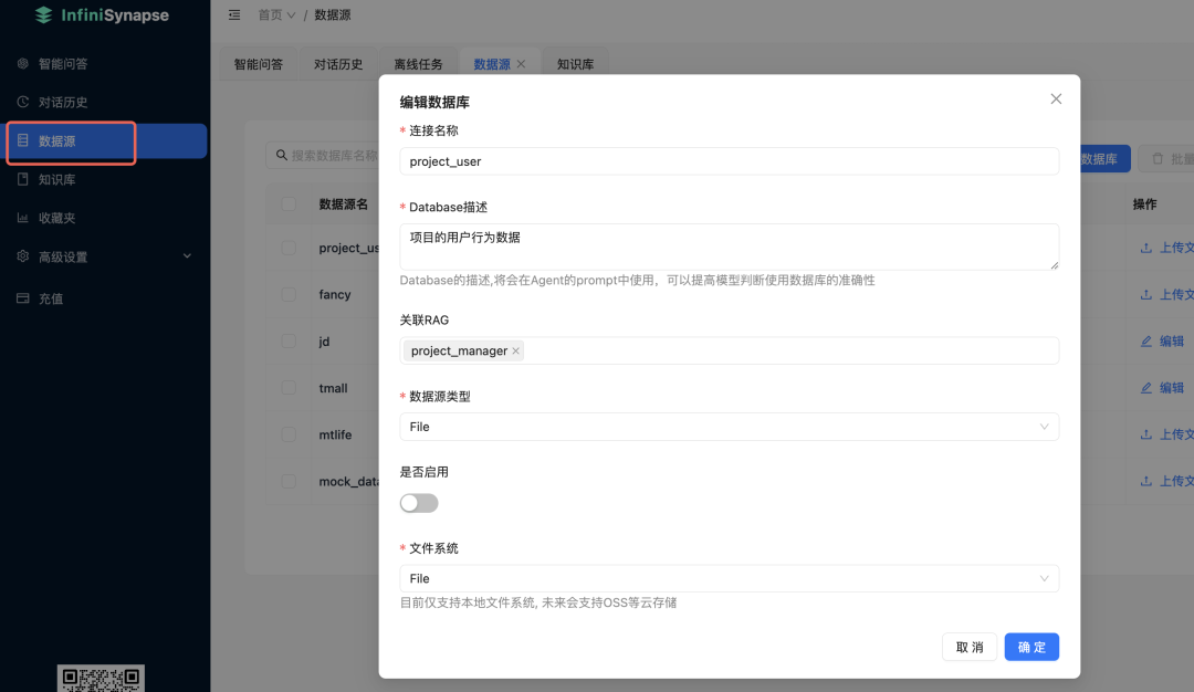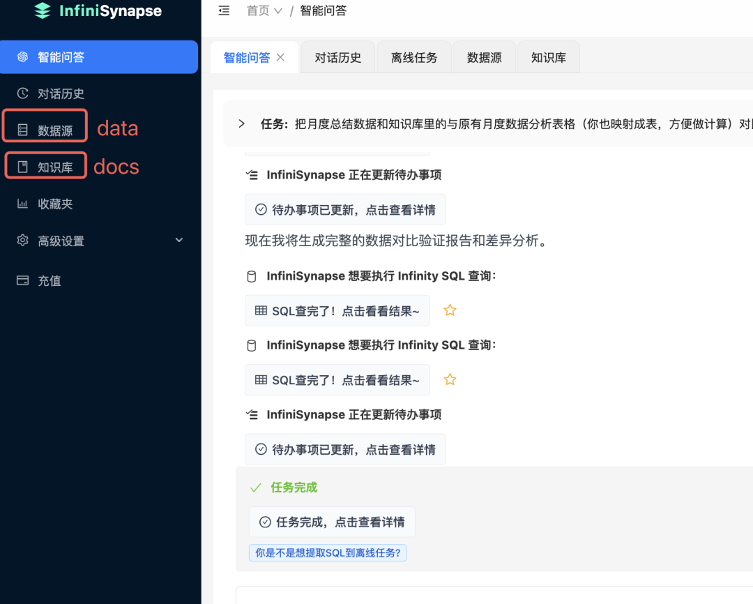 InfiniSynapse 对两类数据分别做了映射,docs 数据映射到知识库,data 类的数据放在数据源。