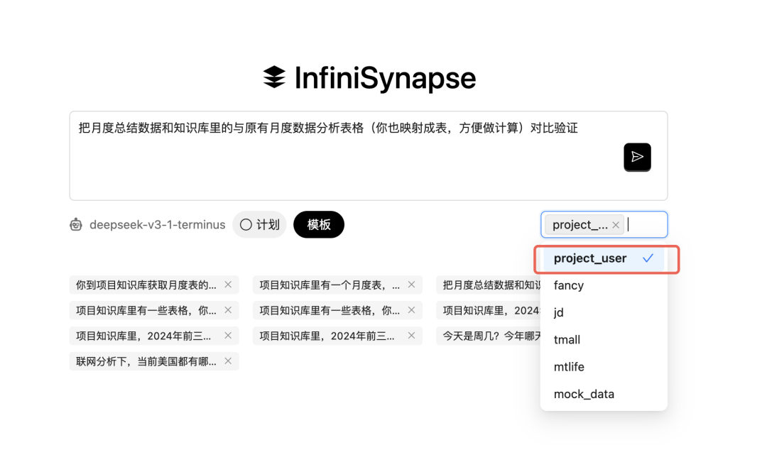 如前所述,在实际场景里,我们可能希望从知识库获取一个小的二维表格,然后和数据集里的实际数据做关联分析。 InfiniSynapse 支持这种融汇贯通。我们一个一个来。