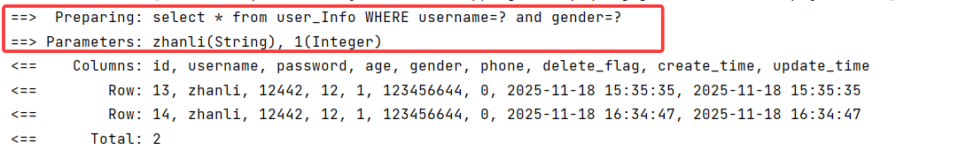 select * from user_Info WHERE username=zhanli and gender=1