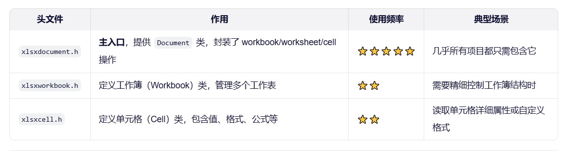 QXlsx::Document *xlsx; // Excel 文档对象