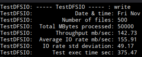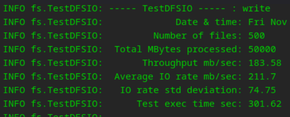 ./bin/hadoop jar share/hadoop/mapreduce/hadoop-mapreduce-client-jobclient-3.3.1-tests.jar TestDFSIO -write -nrFiles 500 -size 100MB -bufferSize 8388608 -resFile /tmp/testDFSIOwrite.log