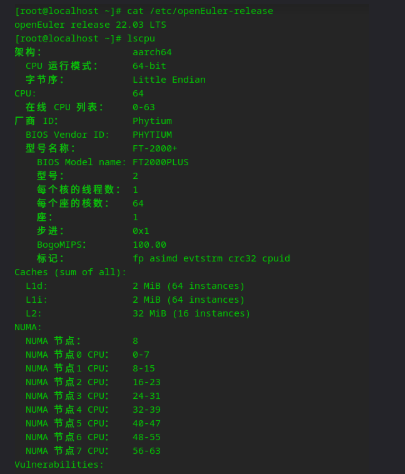 lscpu输出对应的是一台服务器:采用 ARM aarch64 架构,搭载飞腾 FT-2000+/64 64 核单线程处理器,分 8 个 NUMA 节点优化内存访问,配备 L1(每核 32KB)、L2 缓存,是典型 64 核服务器配置