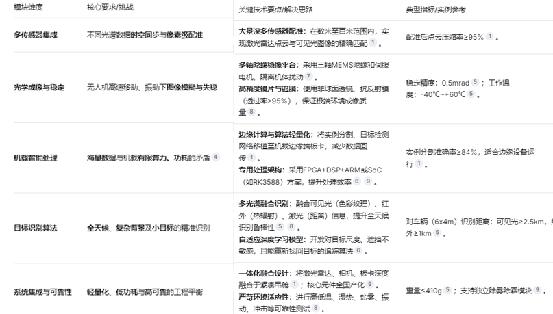 无人机吊舱的光电识别模块,其核心是通过"眼睛"(多光谱传感器)与"大脑"(机载智能处理器)的协同,在复杂环境中实现目标的精准感知与识别。其技术要点、难点与运行方式如下表所示: