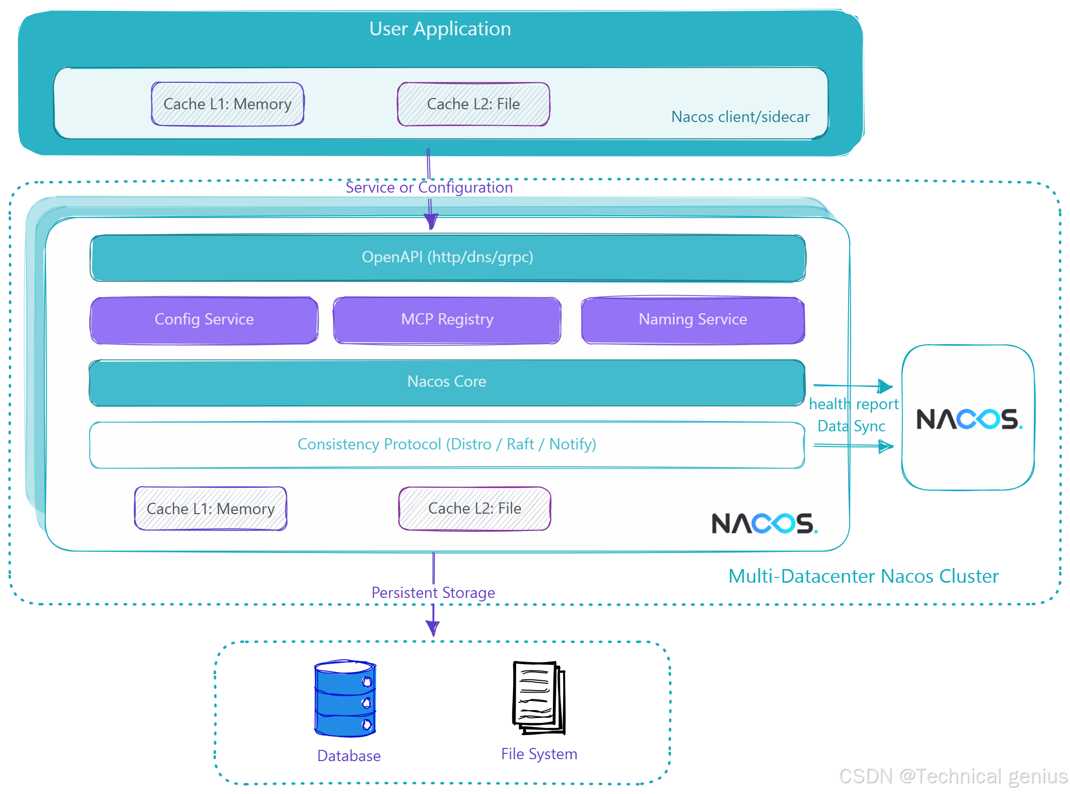 Nacos采用四层架构设计,实现高内聚低耦合: