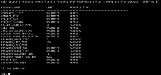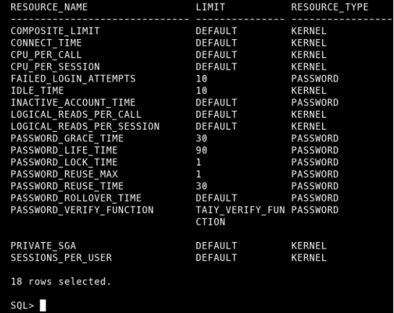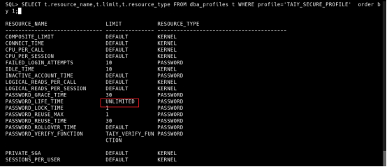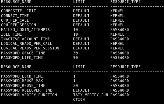 SELECT t.resource_name,t.limit,t.resource_type FROM dba_profiles t WHERE profile='TAIY_SECURE_PROFILE' order by 1;