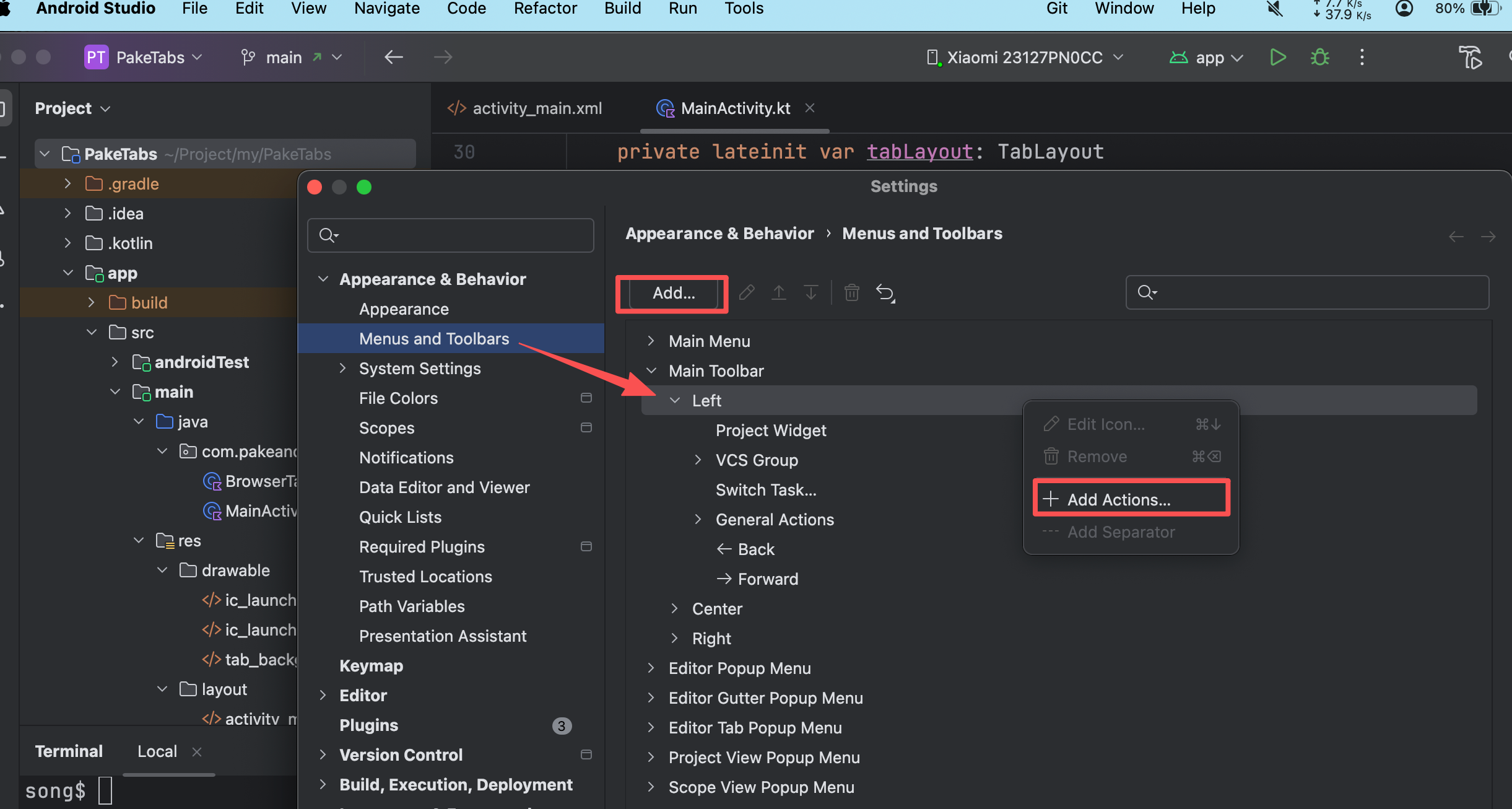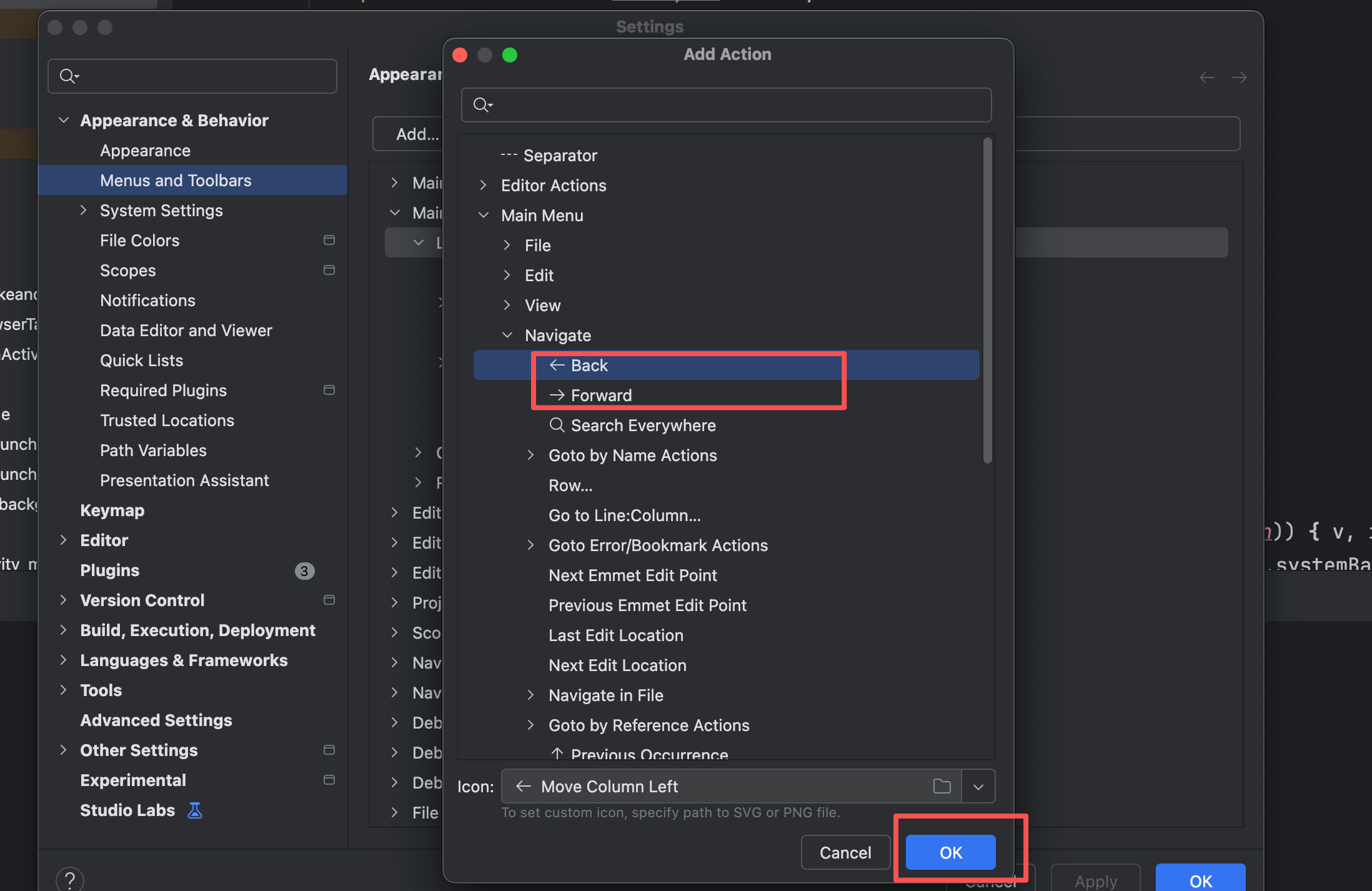 File->Settings->Appearance&Behavior-> Menus and Toolbars-> Left(自己习惯选择Left或Center或Right), 然后点击右键选择Add Action,在Add Action界面选择Main Menu中的Navigate里面的Back、Forward即可。如下图: