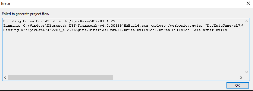 Building UnrealBuildTool in D:/EpicGame/427/UE_4.27... Running: C:\Windows\Microsoft.NET\Framework\v4.0.30319\MSBuild.exe /nologo /verbosity:quiet "D:/EpicGame/427/UE_4.27/Engine/Source/Programs/UnrealBuildTool/UnrealBuildTool.csproj" /property:Configuration=Development /property:Platform=AnyCPU Missing D:/EpicGame/427/UE_4.27/Engine/Binaries/DotNET/UnrealBuildTool/UnrealBuildTool.exe after build