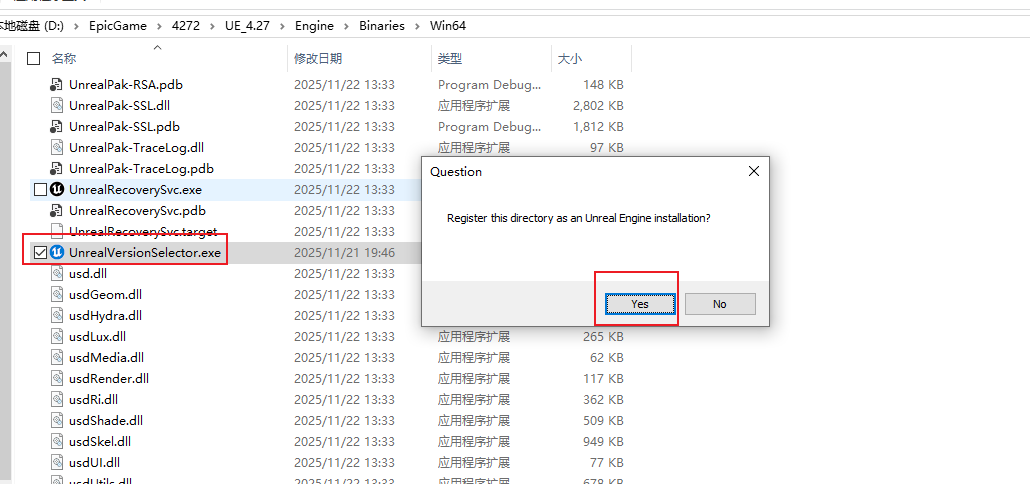 然后将4.27目录下的UnrealVersionSelector.exe右键以管理员身份运行,然后点yes即可。