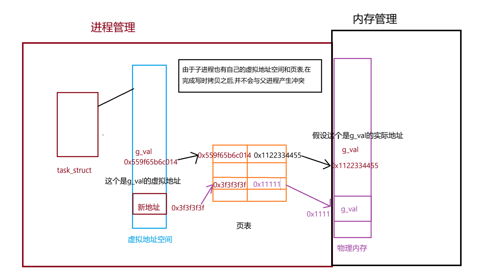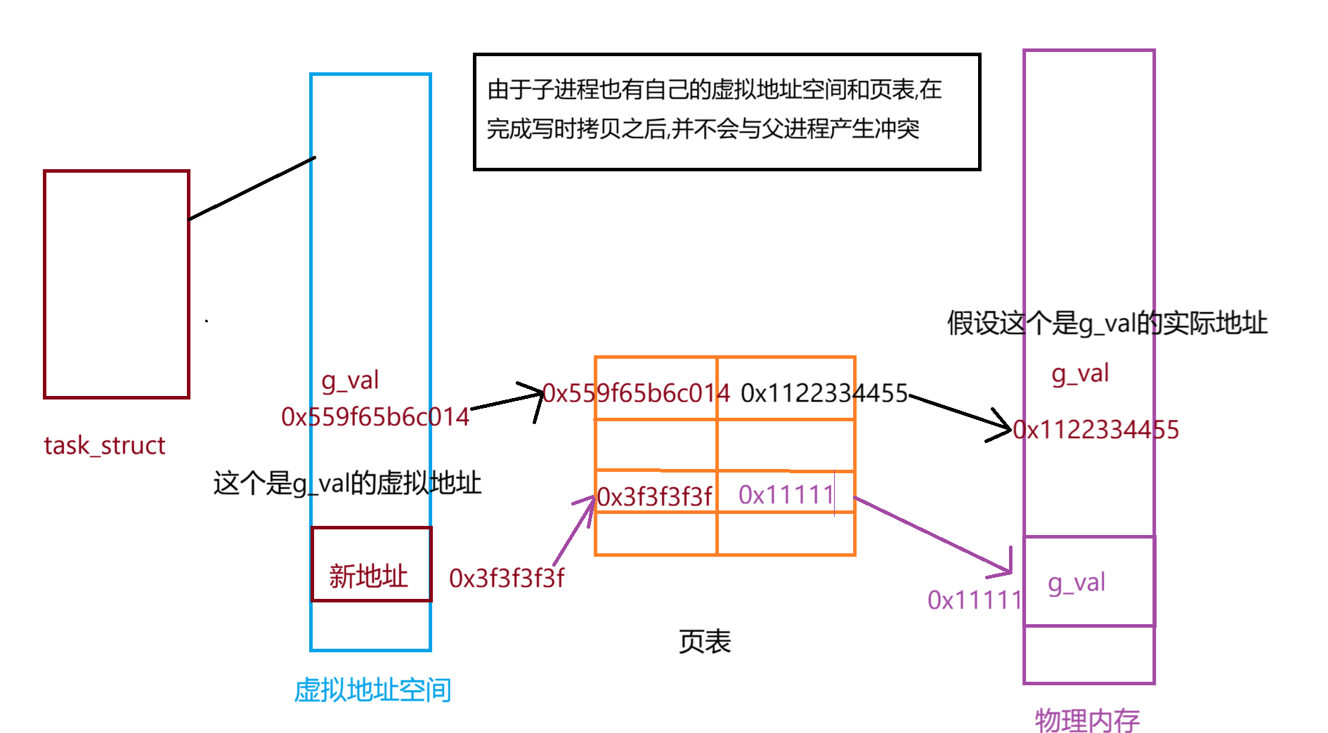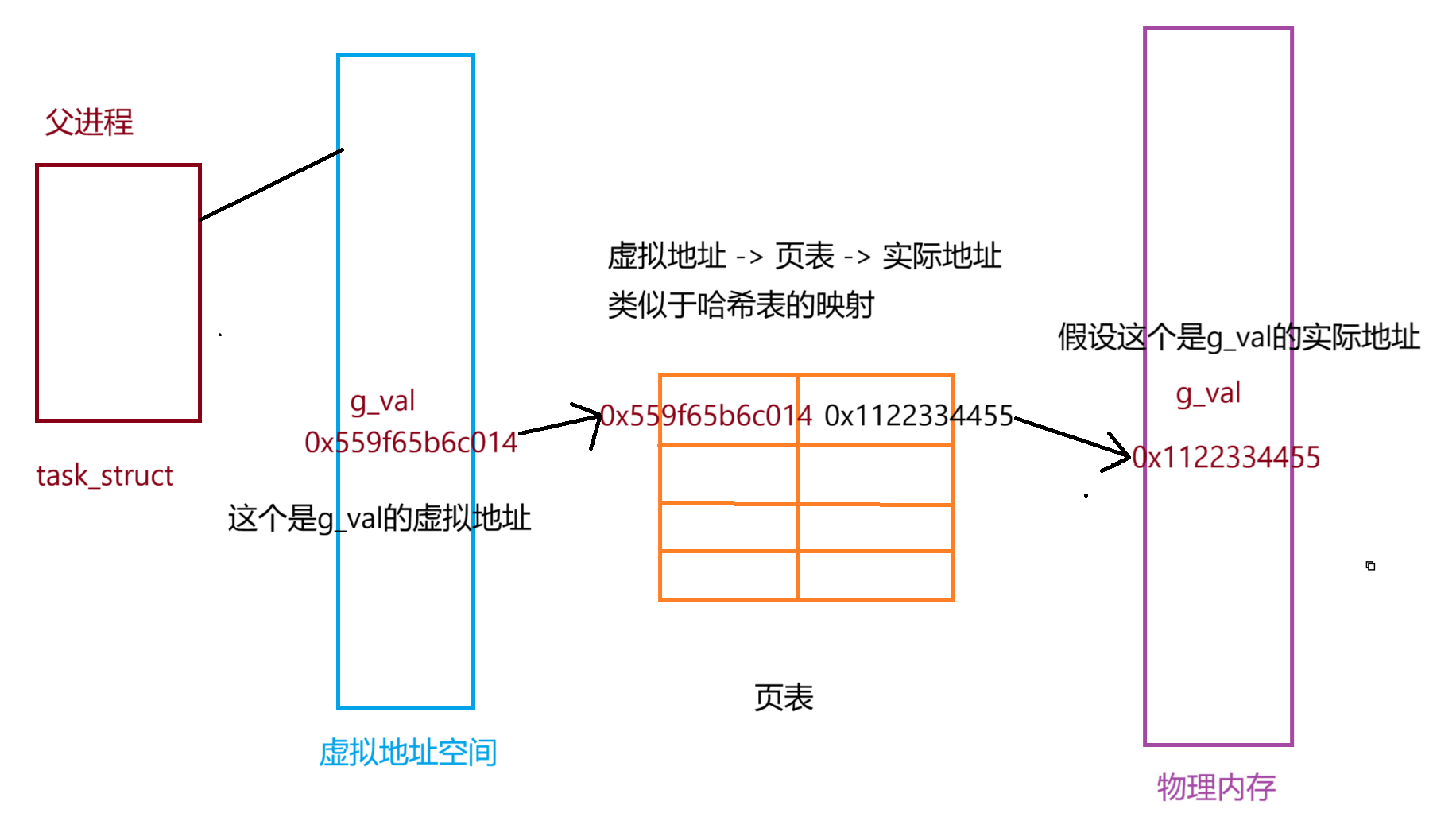 其实父进程中 存在着一个虚拟地址空间,还有链接虚拟地址空间和物理内存的页表,