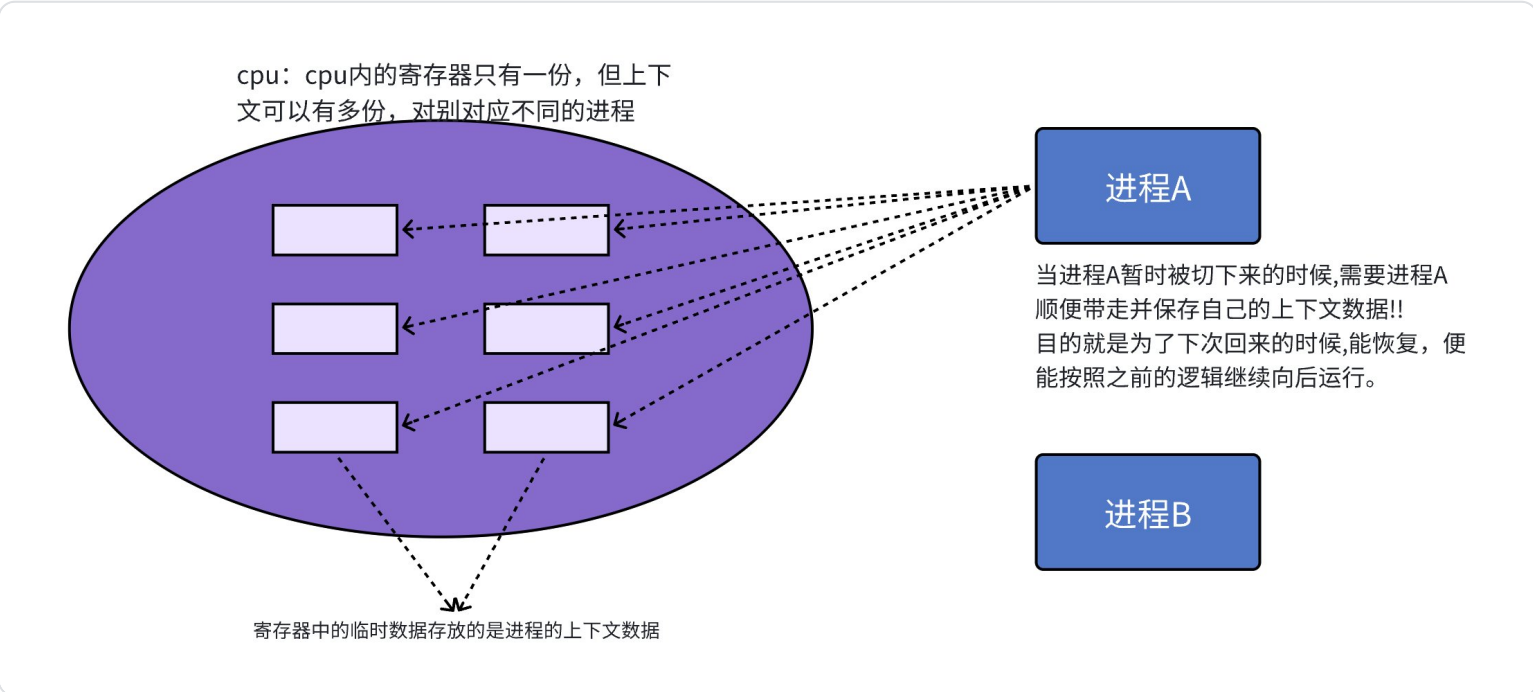 首先要清楚一个概念:寄存器是共享的,但是寄存器里面的数据是进程私有的,这里面的数据叫做进程的上下文. (联想之前我们讲的休学和返学的例子).