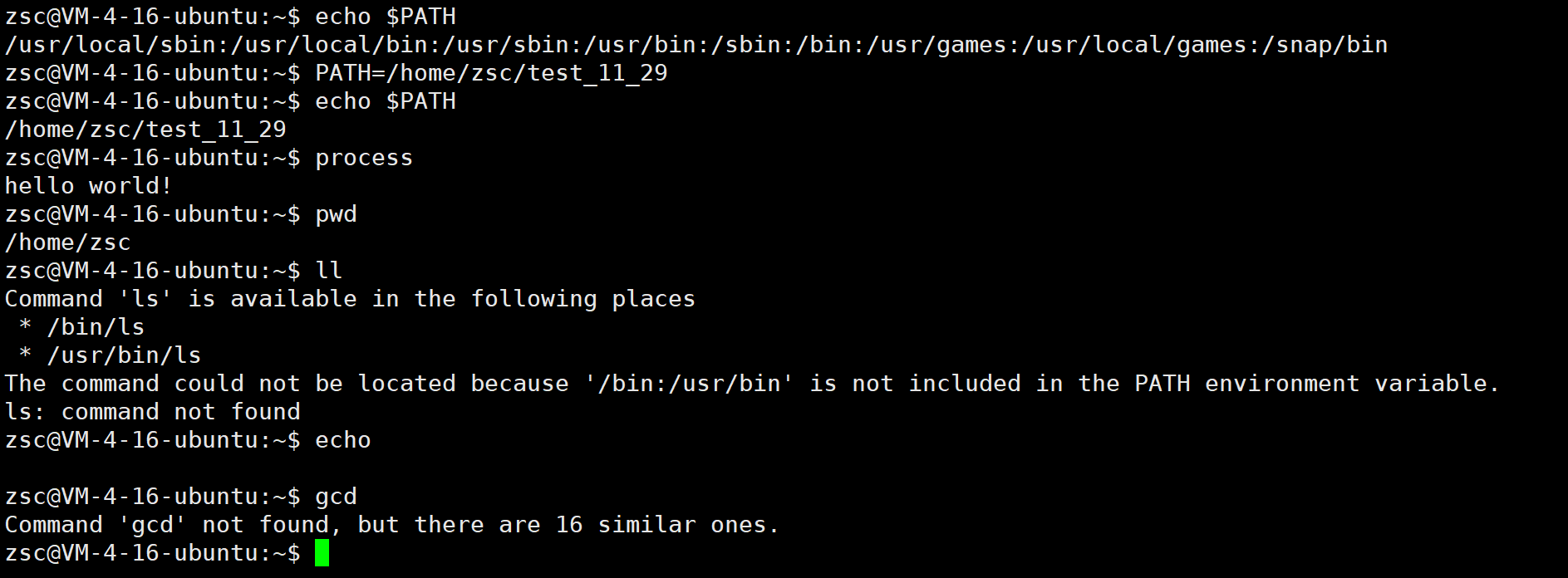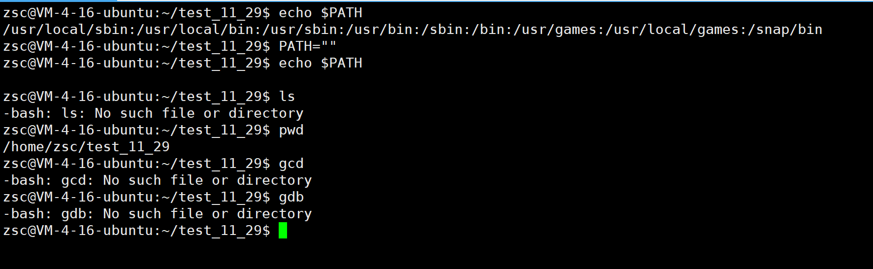 可以看到PATH变量被清空之后很多指令都不能使用了,但是pwd指令还能运行,这是为什么呢?这是因为pwd属于内建命令,也就是说同是命令,但命令和命令之间亦有差别,