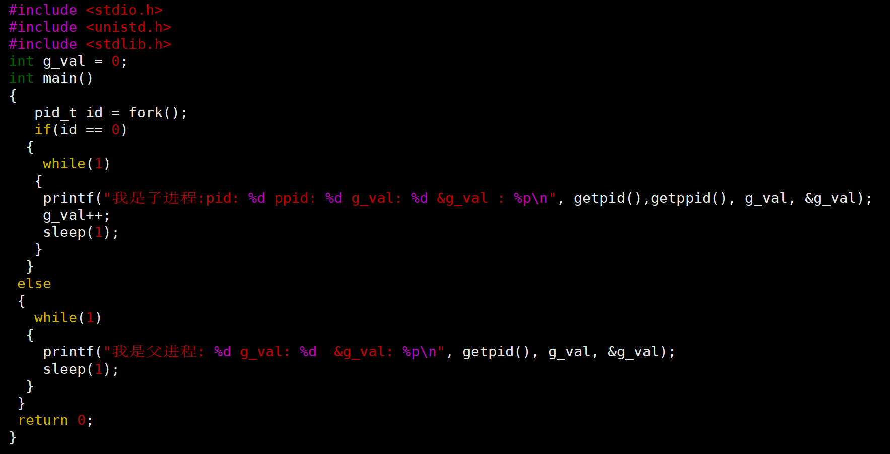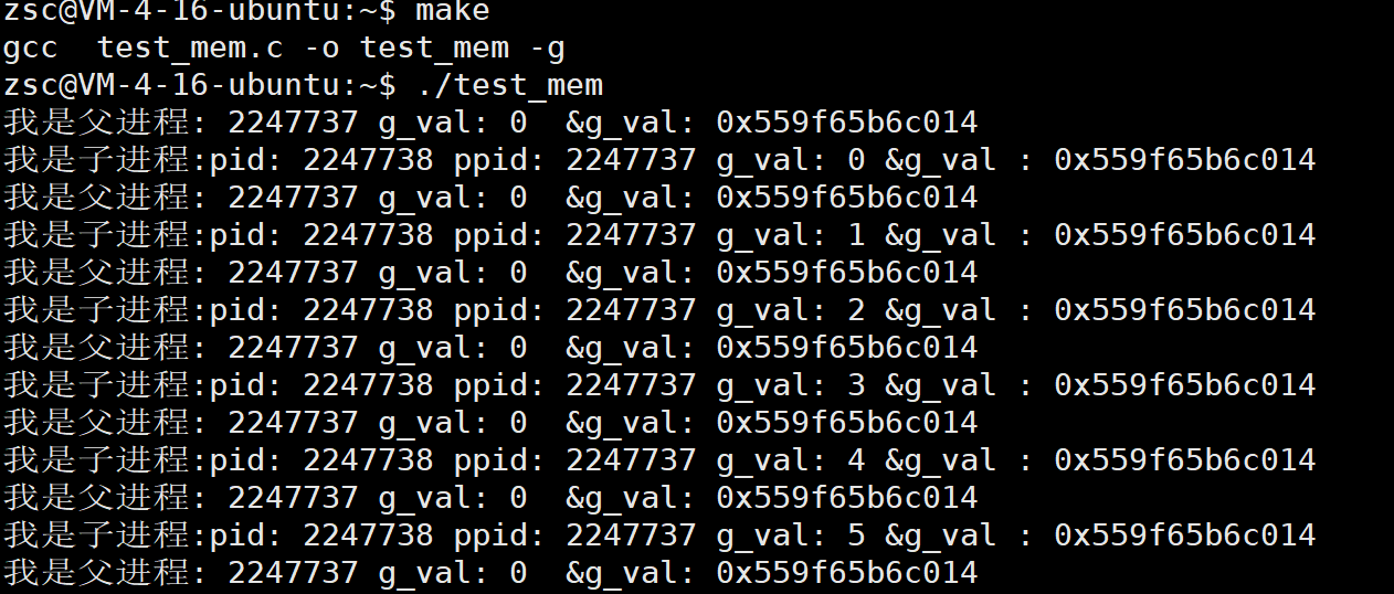 父进程通过fork 创建子进程,子进程可以共享父进程的数据,因此在子进程中也可以打印g_val 的值,这没问题,我知道,但这里子进程对g_val 进行了自增操作,之后打印出的值也变化了,但是父进程那里打印出的值还是0,怎么会这样呢? 一个g_val 怎么可能同时为0,又同时等于其他值呢? 这不合理吧!