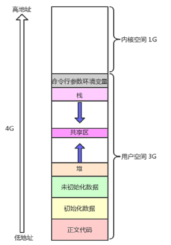 之前在C语言学习阶段,大家可能见过这张图(在正文代码和初始化数据之间其实还有一个常量区):