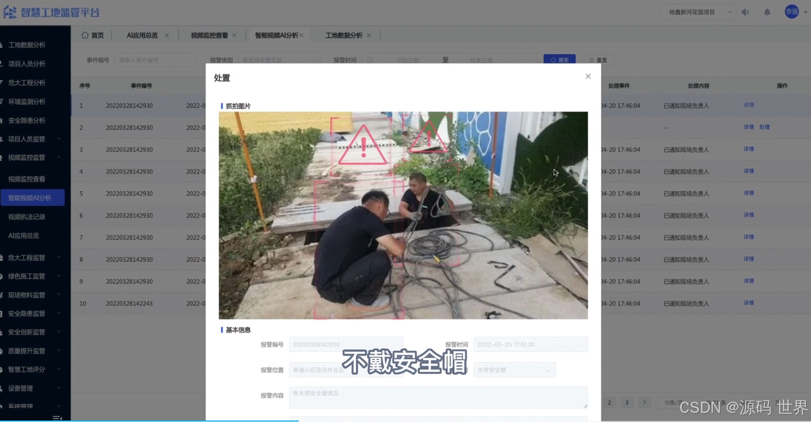 1、实时监测报警(监测类型:环境监测、基坑监测、塔机监测、升降机监测、螺栓松动监测、高支模监测、卸料平台监测、智能烟感监测、吊篮监测、外墙脚手架监测、钢结构安全检查、施工临电箱监测、大体积混凝土检查、桩基数字化监测、强夯数字化监测、智能压浆监测、试验室项目监测、污水监测、结构混凝土质量、钢丝绳损伤监测、车辆智能分析、AI危险源识别、喷淋监测、视频监控)