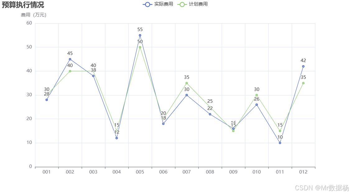 "实际费用": [28, 45, 38, 12, 55, 18, 30, 22, 16, 26, 10, 42],