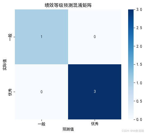 图表展示部分采用了Seaborn绘制中文标注的混淆矩阵,清晰显示模型在区分"优秀"与"一般"绩效等级上的识别能力。