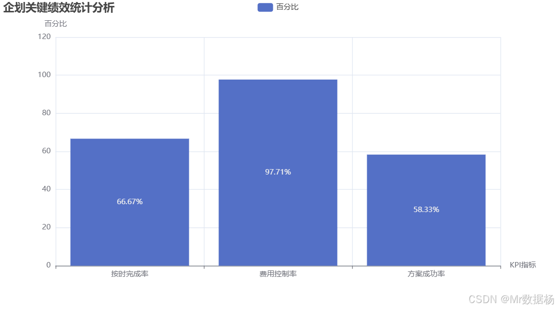 在企划管理中,为了全面监控部门的任务执行效率、预算控制能力以及方案产出质量,可通过基础统计学方法对关键KPI进行分解与可视化。该应用旨在建立一个多维度KPI统计模型,通过模拟数据对"企划任务按时完成率""费用控制率""企划方案成功率"三项指标进行结构化评估,辅助企划管理人员在季度或年度中形成任务进度和质量的清晰画像。通过对模拟数据的统计分析,可以了解实际任务完成效率与预算执行能力的匹配程度,为绩效优化提供依据。该案例基于统计分析方法,注重数据比率计算、异常值识别和趋势直观展示。