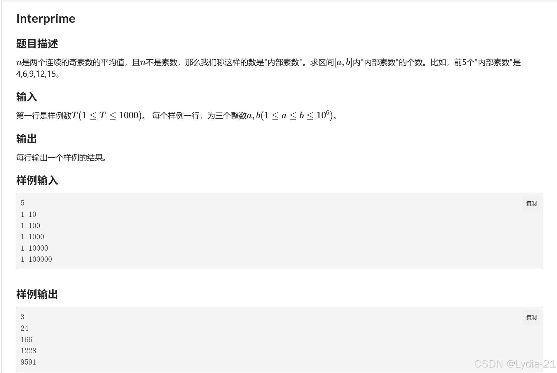 计算[a,b]内满足要求的所有内部素数的个数问题,看到区间和,就想到前缀和 ,所以我设置一个f数组,初始化为0,如果avg是满足要求的内部素数,那么f[avg]=1,这是为了方便统计个数,再计算前缀和数组,f[i]+=f[i-1],这里相当于把 f 计算完前缀和以后又赋值给 f,因为这里我们并不需要知道具体那个数是不是内部素数,而是关注的是个数。