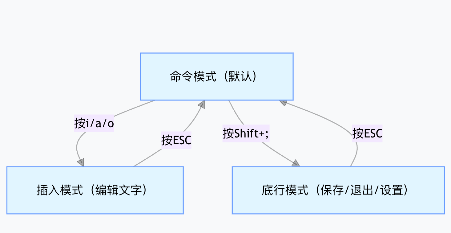 --INSERT--); - 底行模式(last line mode):执行保存、退出、列行号等操作。