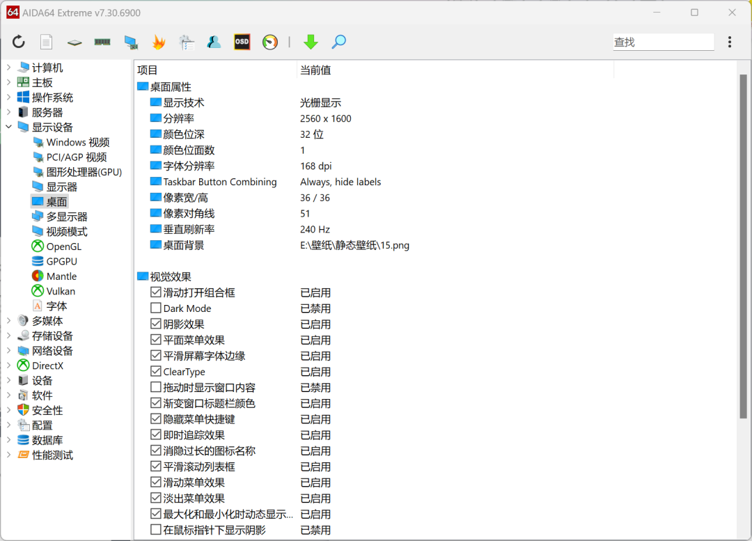 桌面可以检测显示技术、分辨率、颜色位深、颜色位面数、字体分辨率、像素等等。