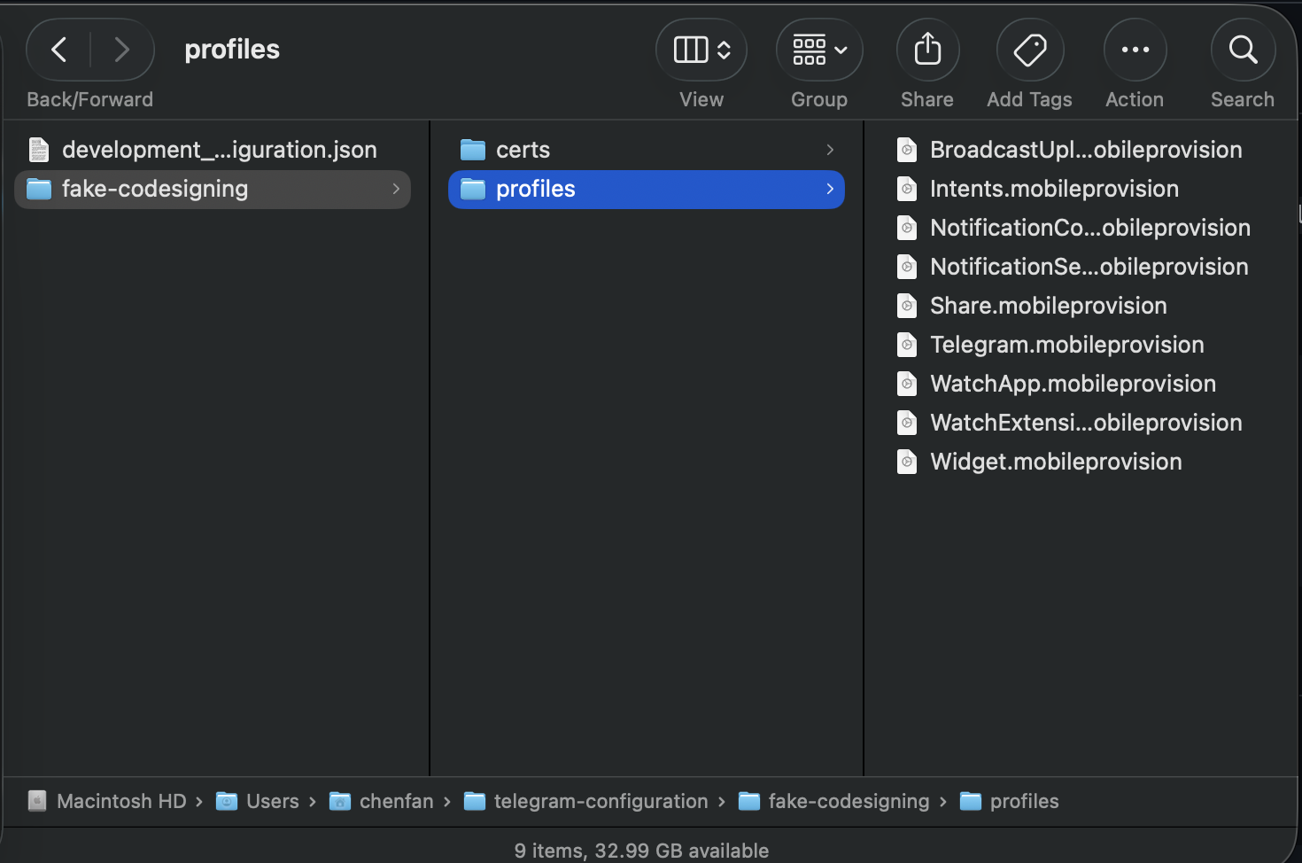 拷贝Telegram-iOS下的build-system部分内容到Home路径下,并且创建对应的profile文件,需要和权限和官方保持一致