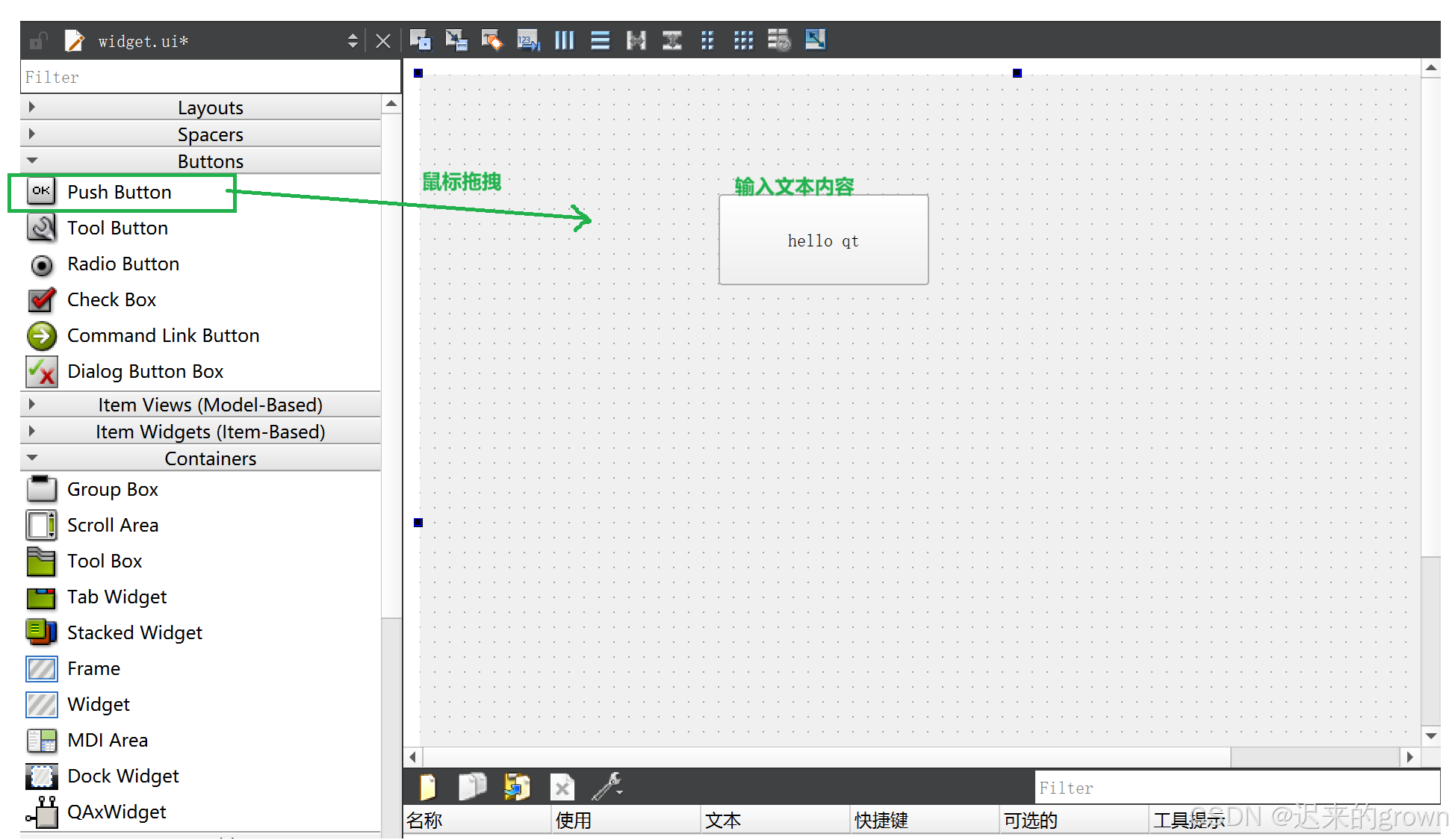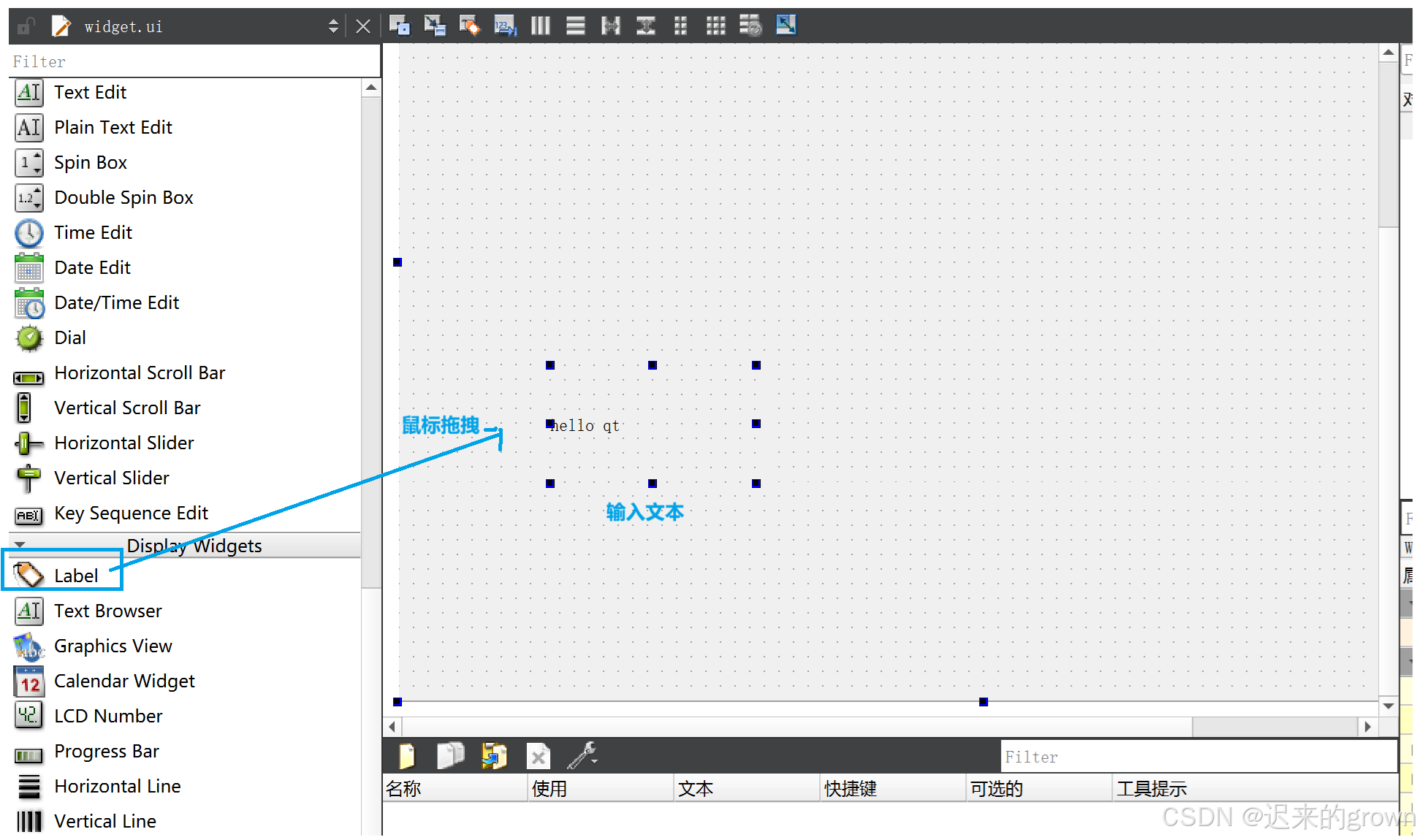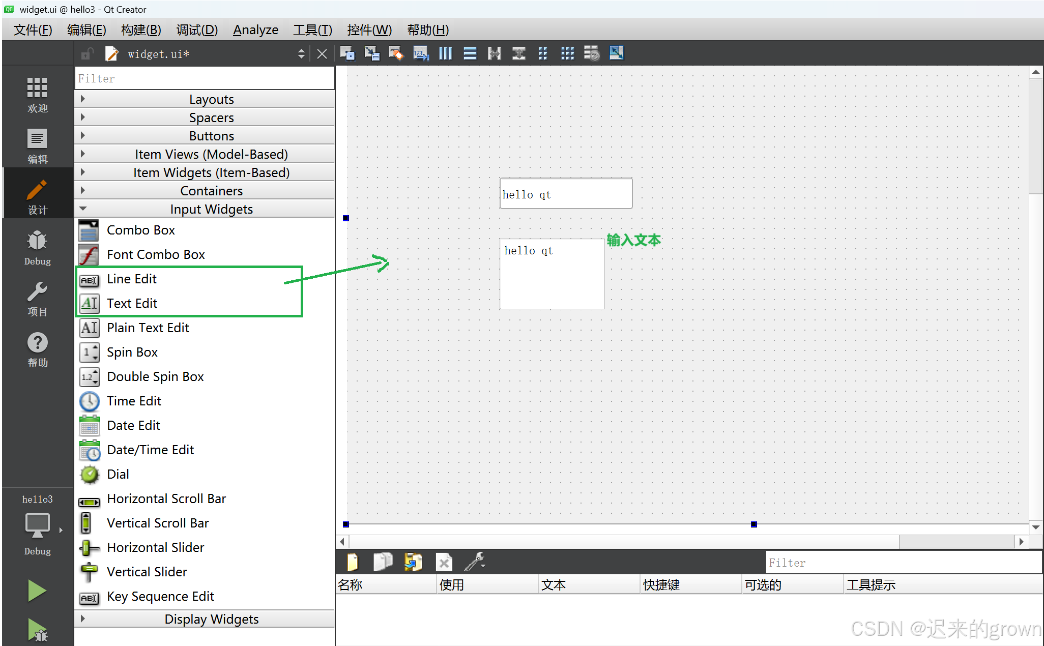 除了使用文本框,我们还可以创建一个输入框控价,里面的内容设置成hello qt