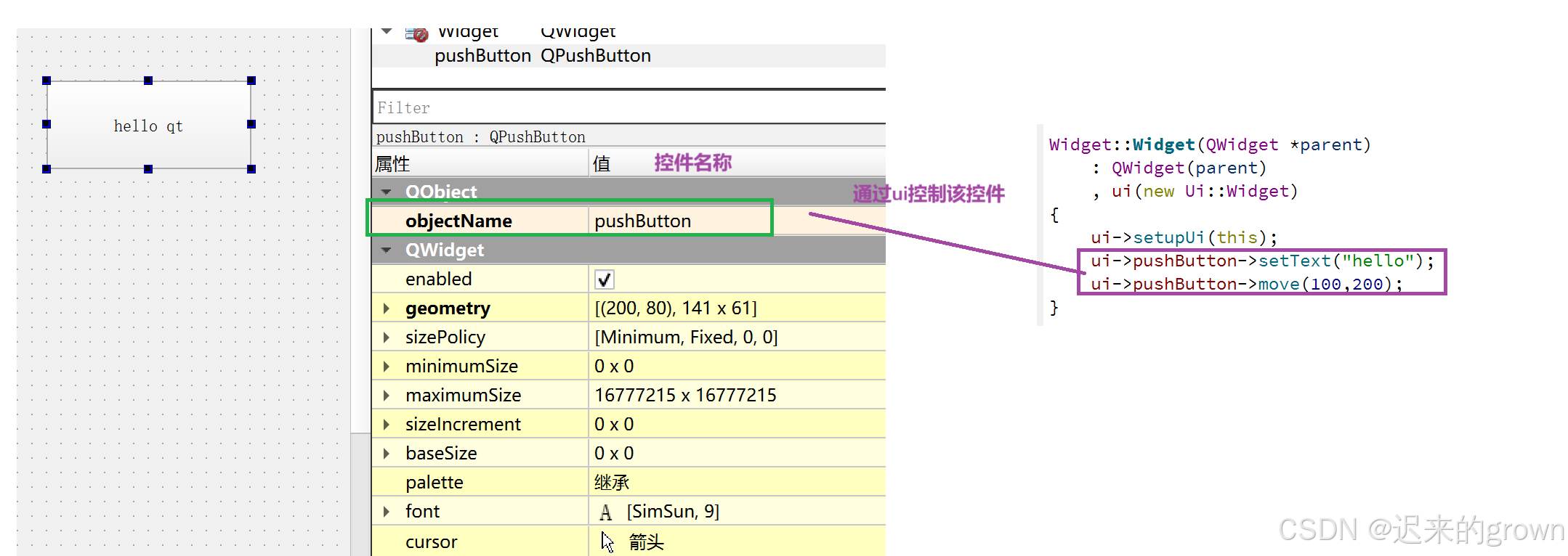 要通过代码来控制图形化界面创建的控件,就要使用到成员变量Ui::Widget *ui,使用图形化界面创建的控件都在ui指向的对象当中。