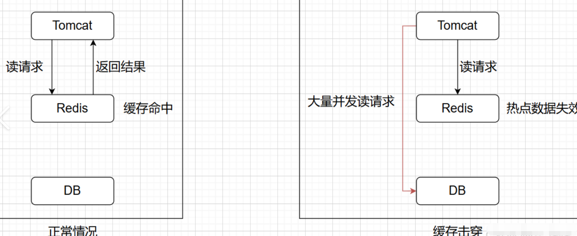 一般指缓存中没有,但是数据库中有该数据,缓存击穿一般是在同一段时间内访问同一个数据,该数据在缓存中超时失效,导致大量的请求直达数据库,导致数据库压力增大。