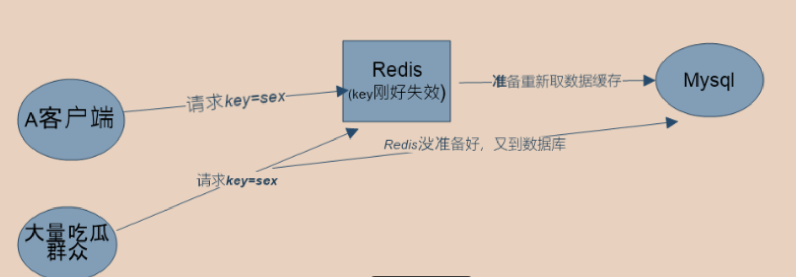 当服务器重启或者大量缓存集中在某一个时间段内失效,这样在失效的时候,如果有大量的请求访问缓存,由于缓存中的数据都失效了,就会到数据库中进行查找,导致数据库瞬间的访问量飙升,导致系统崩溃。