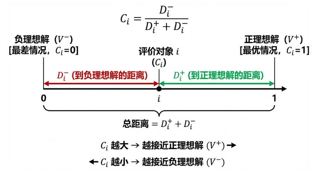 TOPSIS (Technique for Order Preference by Similarity to ldeal Solution): 一种多目标决策分析方法 。它通过计算每个待评价对象(如不同模型)与理想解 和负理想解 的距离,来确定其相对优劣,从而得到一个科学的排序。